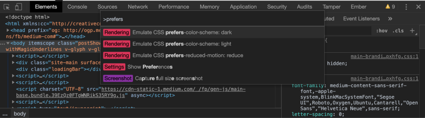 Откройте DevTools (F12), нажмите shift+cmd/ctrl+P для открытия командной строки, введите prefers и выберите опцию: