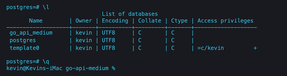 psql postgresоткрывает командную строкуpsqlпод пользователемpostgres.CREATE DATABASE go_medium_api;cоздает нужную нам базу данных.\lвыводит список всех баз данных.\qзакрывает командную строку.