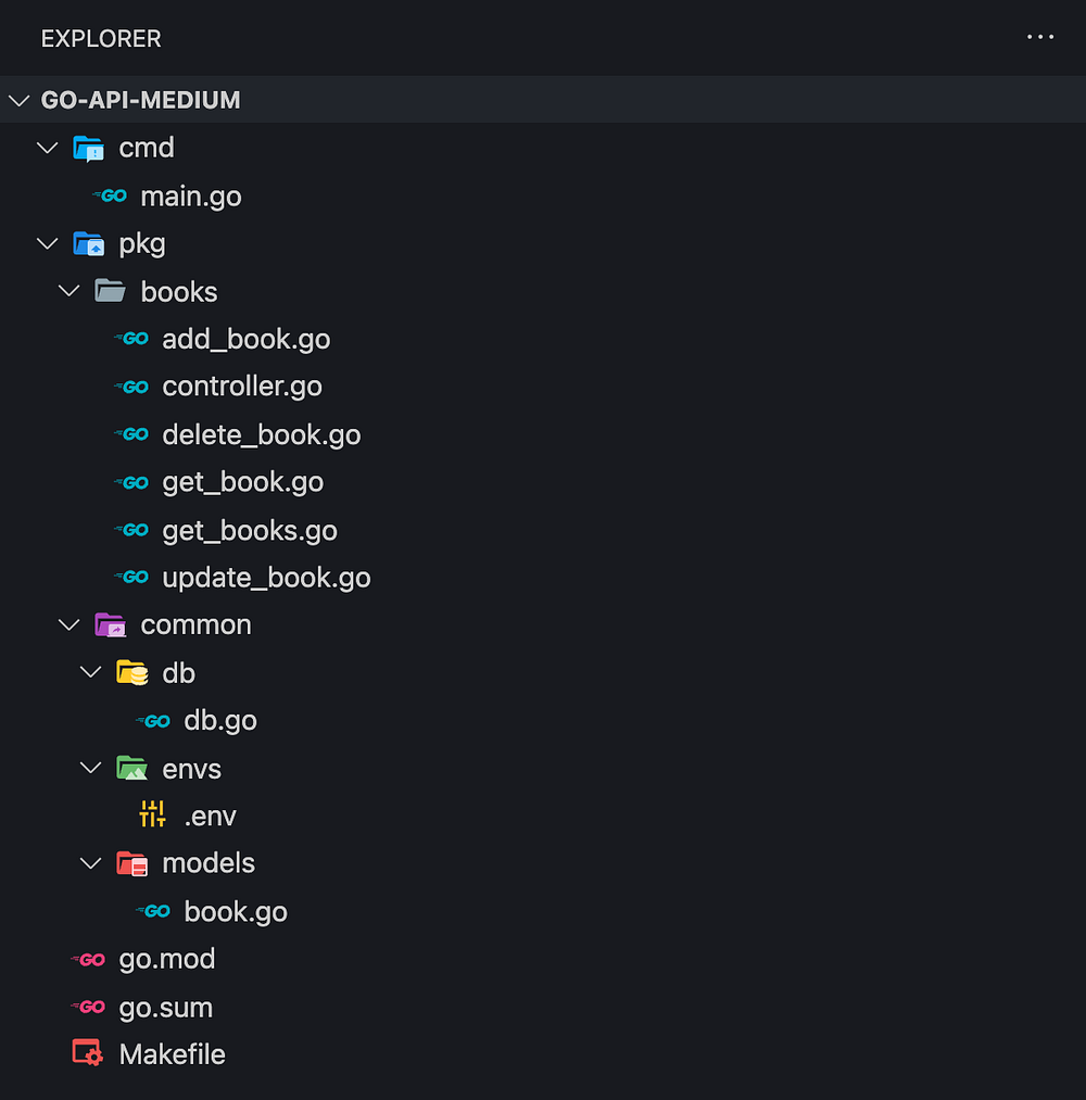 $ touch Makefile cmd/main.go pkg/books/add_book.go pkg/books/controller.go pkg/books/delete_book.go pkg/books/get_book.go pkg/books/get_books.go pkg/books/update_book.go pkg/common/db/db.go pkg/common/envs/.env pkg/common/models/book.go