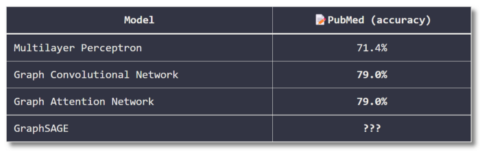 Я не смог найти результатов для GraphSAGE на PubMed, используя эту специфическую настройку (60 обучающих узлов и 1000 тестовых), так что не рассчитываем на высокую точность. Но при работе с большими графами не менее актуальной может оказаться и другая метрика: время обучения.