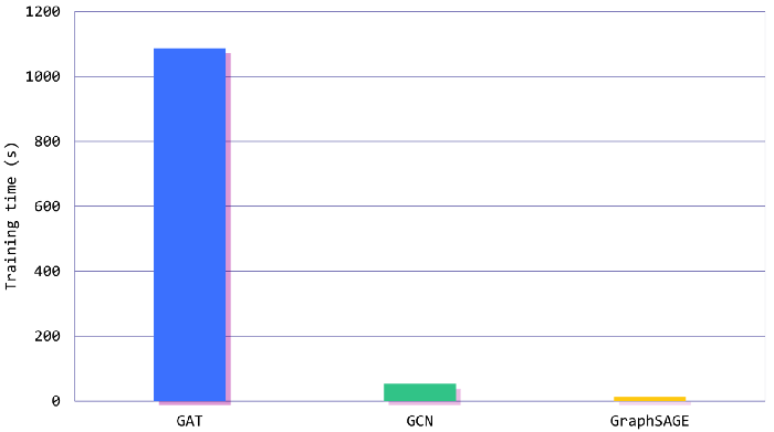 Реальная разница заключается во времени обучения: в данном случае GraphSAGE в 88 раз быстрее GAT и в 4 раза быстрее, чем GCN.