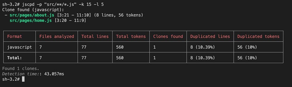 -p— регулярное сопоставление всех файлов по шаблону glob (тогдаsrc/**/*.js— это обнаружение всех файлов с суффиксом js в каталогеsrc).-k— минимальное количество повторений токенов в тегеcode(можете понимать токен как слово, здесь оно установлено на значении 15, тогда фрагмент кода будет обнаружен, только если он содержит 15 слов или более).-l— минимальное количество строк кода, которые должны быть обнаружены (здесь установлено значение 5, то есть обнаружение будет производиться только для кода, содержащего более 5 строк).