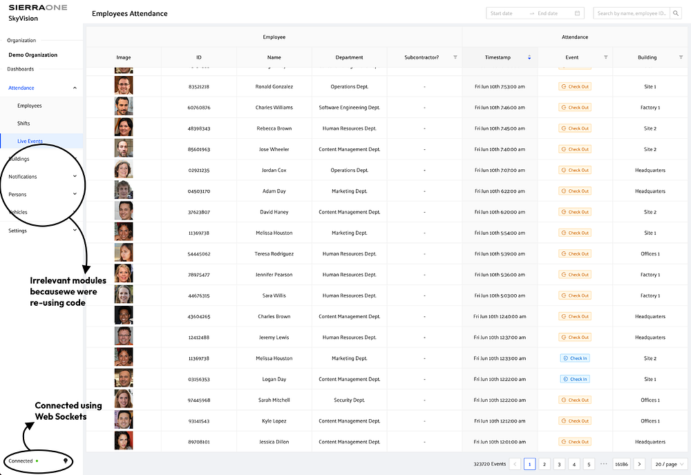 Вся система уже была настроена, и с точки зрения кода нужно было только добавить в нее модуль посещаемости в бэкенд Django и дашборд ReactJS. Бэкенд отвечал за получение событий о посещаемости, хранение их в БД и выдачу указаний Jobs Producer подготовить их для ИИ. Задача дашборда — показывать результаты этого взаимодействия в реальном времени по мере поступления событий. Для этого использовался WebSocket API, управляемый Django Channels.