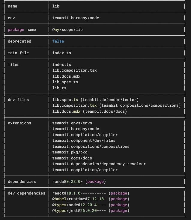 Затем запустите bit show new-lib, и Bit “скажет”, какими зависимостями обладает этот пакет, а также различит зависимости для разработки и другие зависимостями. Вот пример (где new-lib называется просто lib):