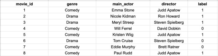 Вы проделываете кропотливую работу, присваивая обозначения предпочтений множеству различных фильмов, которые смотрел ваш друг. С помощью конструирования признаков извлекаете из этих фильмов главных актеров, режиссеров, жанры и другие признаки, добавляя их к обучающим данным. Добавляете также метку, обозначающую, понравился ли фильм вашему другу (1) или нет (0). В итоге получаете набор данных, как показано ниже.