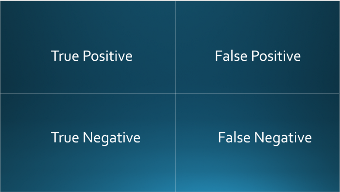 На изображении ниже показаны возможные результаты прогнозирования: ложноположительные (False Positives), ложноотрицательные (False Negatives), истинно положительные (True Positives) и истинно отрицательные (True Negatives).