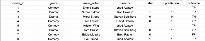 Возвращаясь к примеру с фильмами, вспомним, что у нас был тестовый набор из 300 фильмов, и 90% из них были предсказаны правильно. После выполнения описанных выше инструкций получаем следующее количество точек данных для каждого типа результатов классификатора.