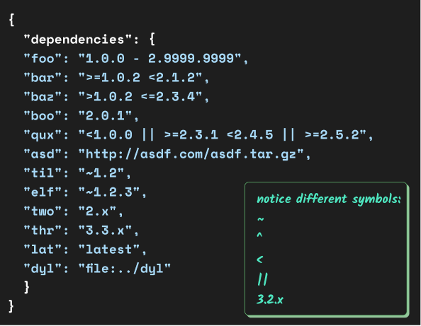 Каково же решение этой проблемы? Для начала разберемся, что означает диапазон версий. Строка, содержащая одно или несколько чисел, разделенных пробелами, называется диапазоном версий. Эти числа также содержат некоторые специальные символы, такие как ^ ~ < ||. Например, ^1.0.4, ~2.3, 4.4.x, >=2.3.4, <1.0.9 ||.