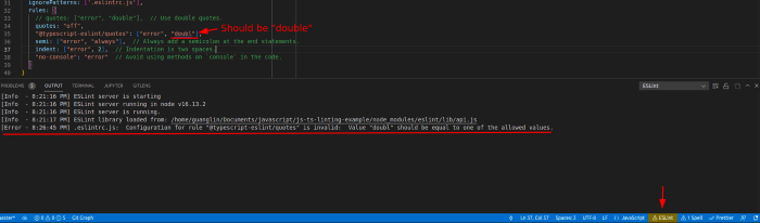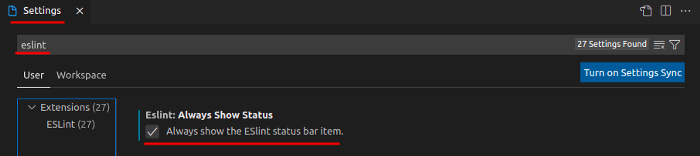 Обратите внимание, что расширение ESLint использует один и тот же конфигурационный файл в папке проекта. Включите строку состояния ESLint, чтобы видеть ошибки, если файл .eslintrc.js настроен неправильно: