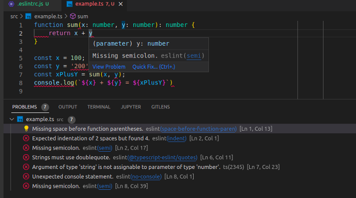 Следует отметить, что непоследовательный тип в строке 7 в example.ts не указывается ESLint. К сожалению, ESLint сообщает только об ошибках собственных линтеров, игнорируя ошибки компиляции TypeScript.