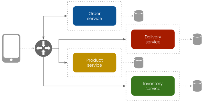 Рефакторинг модульного монолита в микросервисы не представляет сложности, если установлены достаточно строгие границы модуля. Реорганизовывать модули можно по отдельности независимо друг от друга. После полного рефакторинга упомянутого ранее интернет-магазина приложение принимает следующий вид: