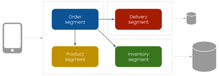 В этом примере каждый модуль размещается в отдельном сегменте. Сегмент Delivery требует балансировки нагрузки (из-за функциональности отслеживания и обработки движения товаров) и развертывается на нескольких серверах. Остальные сегменты сгруппированы и развертываются вместе на одном сервере.