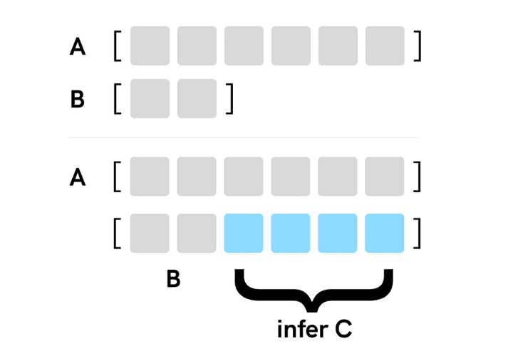 Как видите, первые два случая работают, как и предполагалось. Однако проблема возникает, если массив B больше массива A. Следуя основному свойству вычитания (2 - 5 = -(5 - 2)), поменяем местами A и B и изменим знак результата на отрицательный: