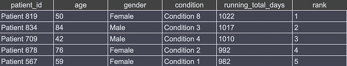 ROW_NUMBER() OVER (ORDER BY running_total_days DESC) AS rankкаждому пациенту присваивается уникальная позиция в соответствии с убывающим порядкомORDER BY running_total_days DESC: чем больше нарастающий итог дней госпитализации, тем она ниже.ROW_NUMBER()— это встроенная функция ClickHouse, ею каждой строке в пределах задаваемого фрейма окна присваивается уникальный номер. - Функцией