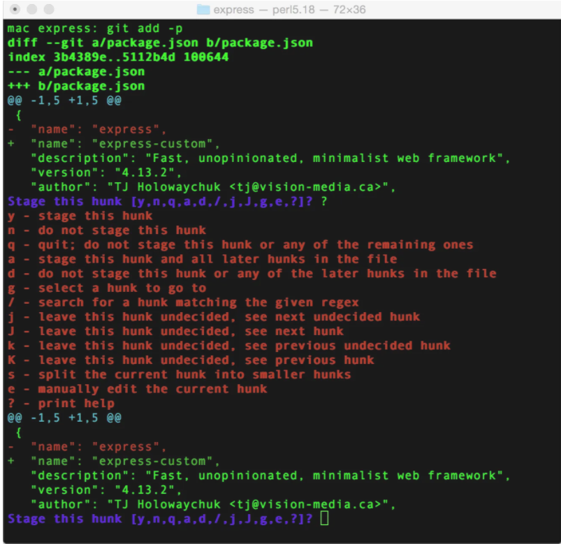 Вероятно, этот совет сильнее всего ускорит вашу работу. При такой подготовке коммитов в Git открывается интерактивная подсказка. Она показывает разделы каждого файла, которые были изменены. Это дает возможности подготовить их к коммиту или пропустить и многие другие возможности.
