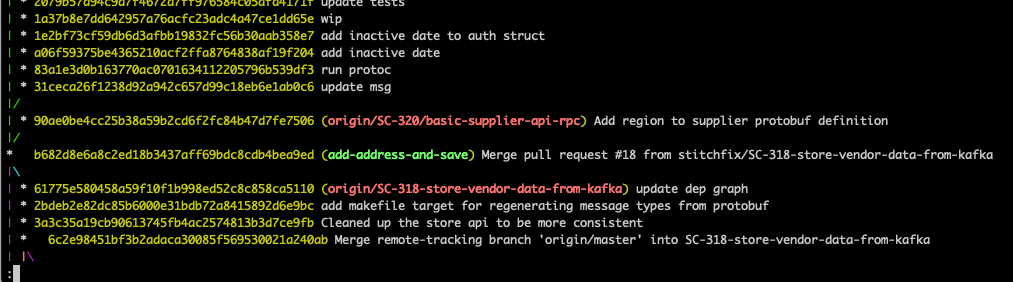 Вы заметите как цветовое кодирование, так и разумное применение | и \\, чтобы обозначить ветки. Хотя эти флаги ничего не меняют в логе функционально, они, безусловно, значительно облегчают понимание вывода git log.