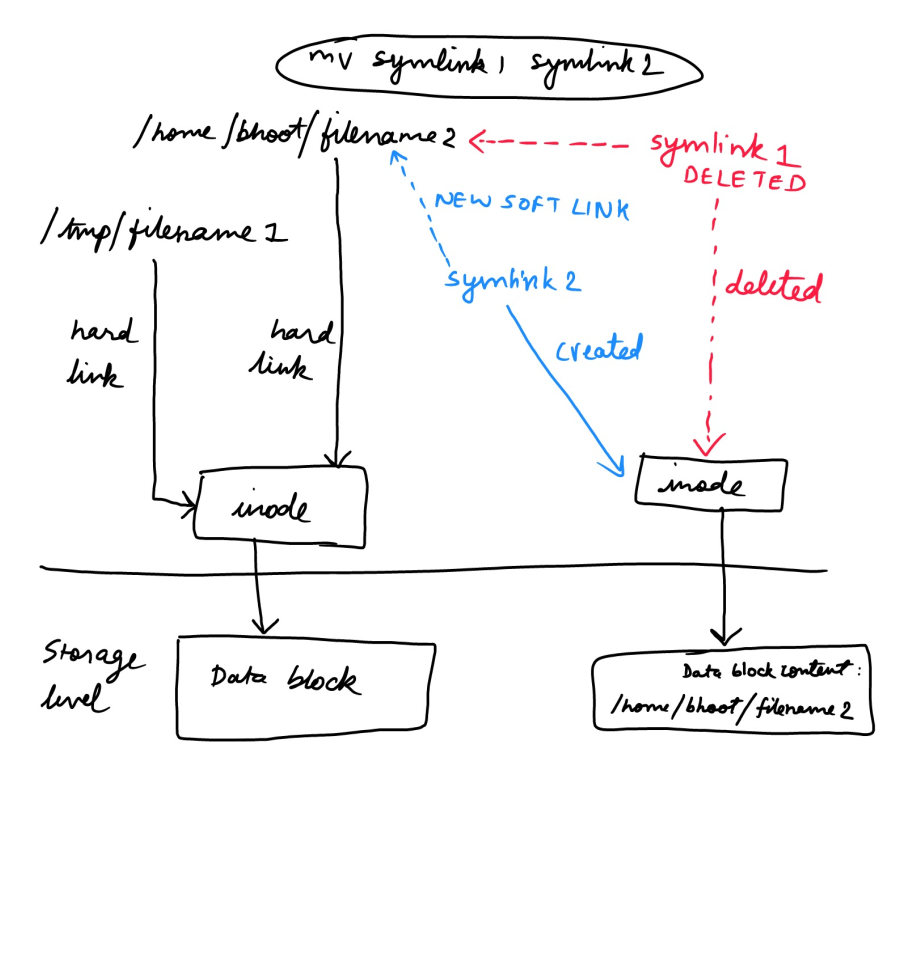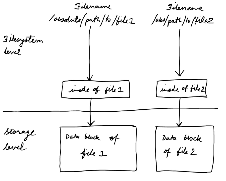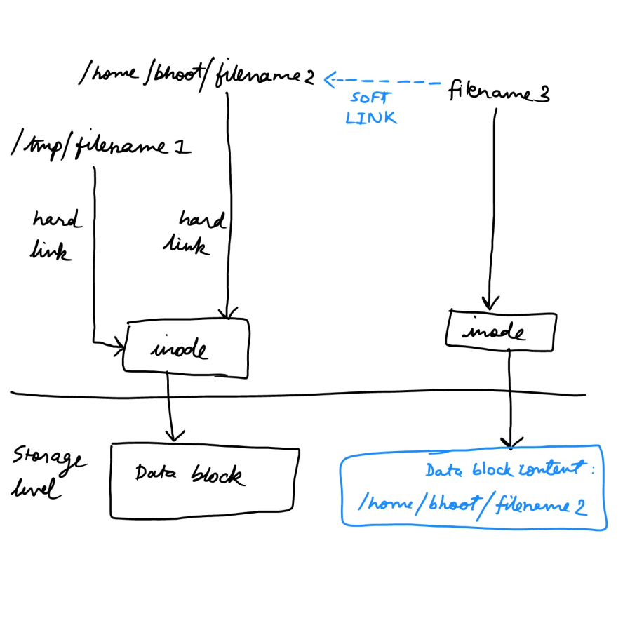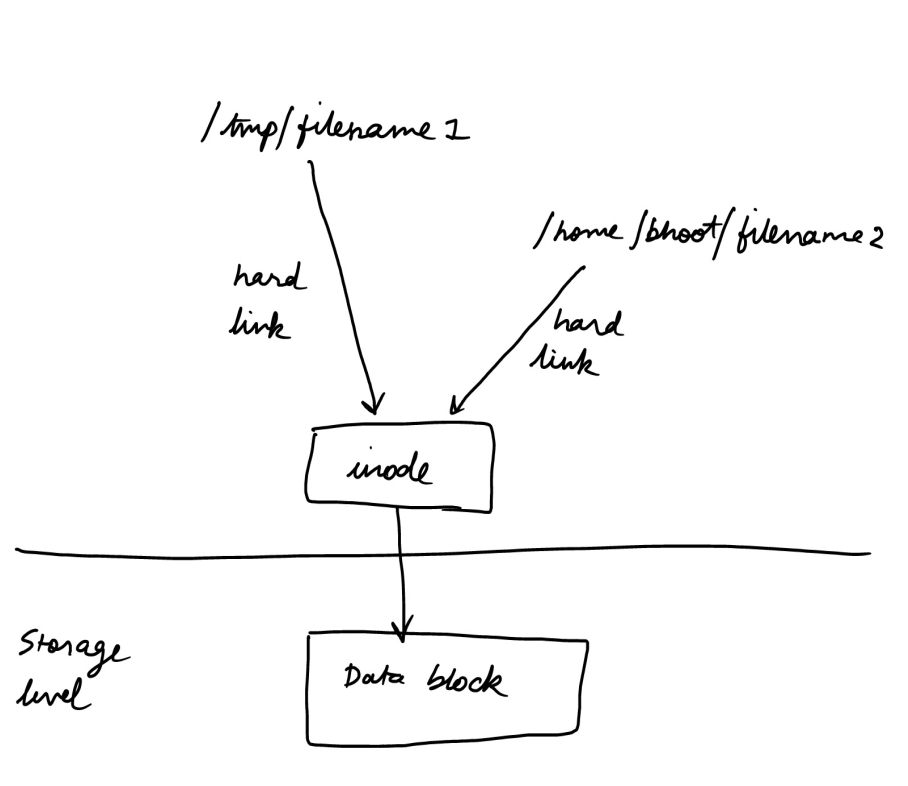 На рисунке выше /tmp/filename1 и /home/bhoot/filename2 указывают на один и тот же индекс. Это две жесткие ссылки. Жесткая ссылка присоединяет путь к индексу.