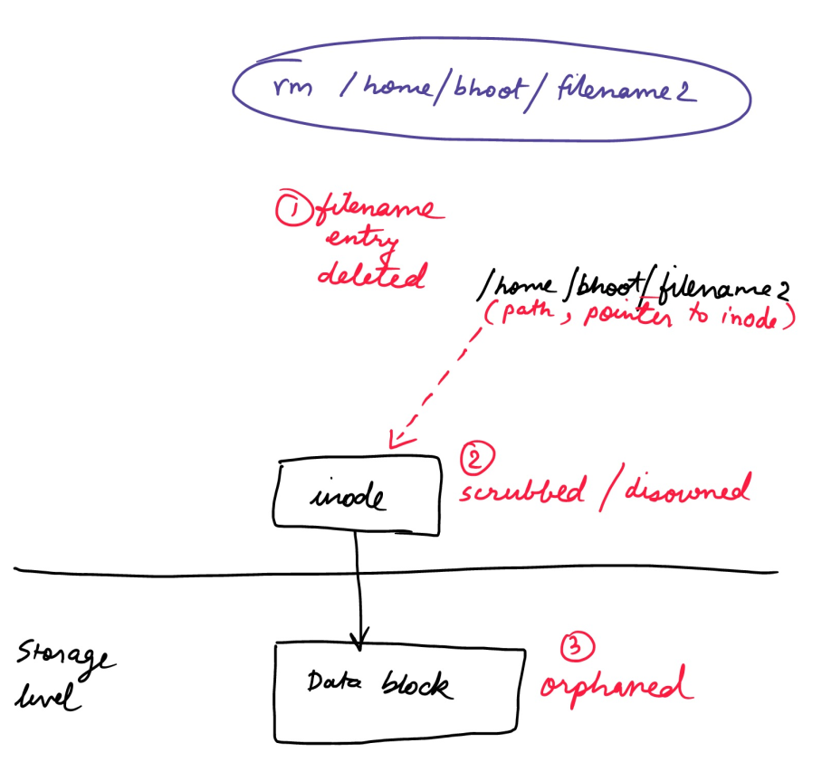 Должна ли rm удалить всю комбинацию — /tmp/имя_файла1 + индексный дескриптор + блок данных? Тогда что произойдет с другим именем пути /home/bhoot/filename2, которое указывает на тот же индексный дескриптор?