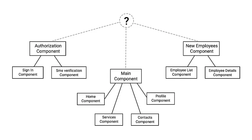 Допустим, у нас уже есть несколько готовых потоков: поток авторизации (AuthorizationComponent), нижняя навигация (MainComponent) и поток новых сотрудников (NewEmployeesComponent). Наша цель — объединить эти потоки.