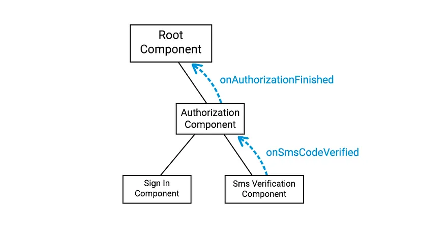Компоненты потока также будут иметь обратные вызовы. Ранее мы добавили обратные вызовы в компоненты экрана, чтобы они могли уведомлять свой поток о событиях. Теперь потоки также будут уведомлять корневой компонент о событиях. При переключении между потоками будет создаваться двойная цепочка обратных вызовов. Например, в потоке авторизации сначала сработает onSmsCodeVerified, а затем onAuthorizationFinished, как показано на диаграмме: