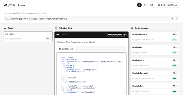 vlt query '[name="my-project"] > :is(:project > *[name="tap"][version="21.0.1"])' --view=gui