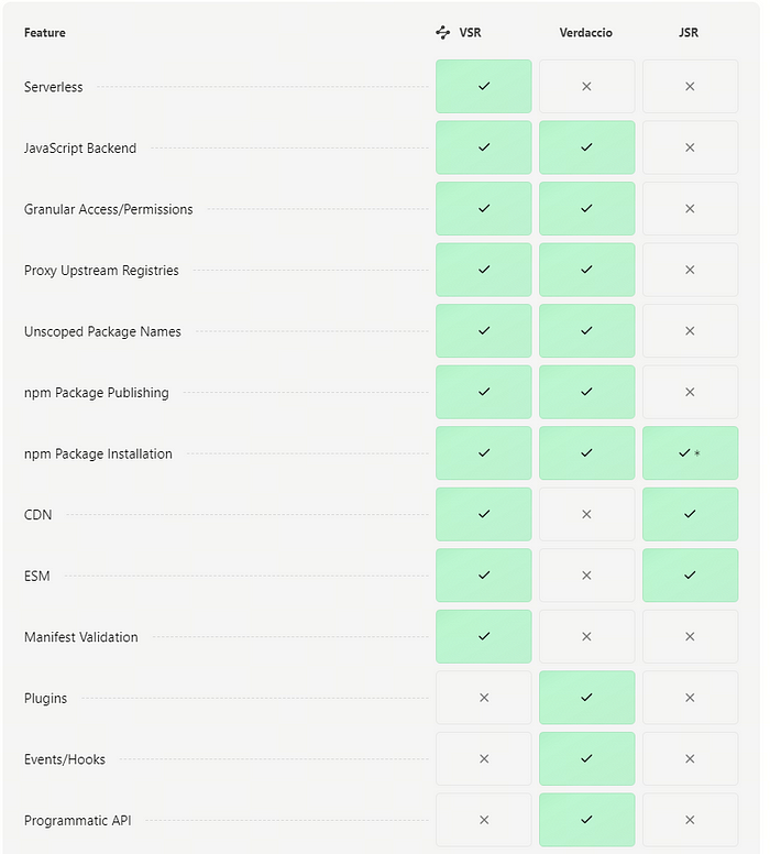 Как vsr выглядит на фоне конкурентов — Verdaccio и JSR? Сопоставим основные достоинства каждого из них.