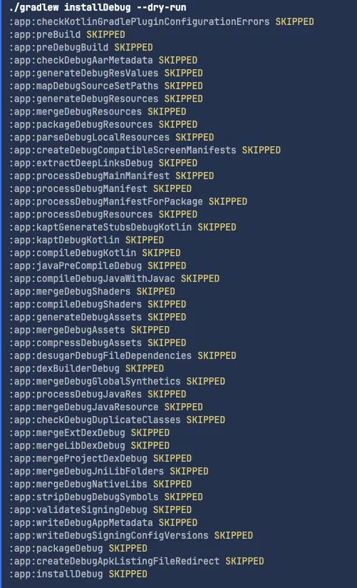 Чтобы предстоящее исследование было более понятным и удобным, воспользуемся техникой под названием «dry run» («пробный прогон»). Она позволит рассмотреть каждую задачу, выполняемую Gradle, не создавая приложение. Это все равно что заглянуть в сценарий перед представлением — предварительный просмотр того, что предстоит увидеть на сцене. Итак, углубимся в процесс, чтобы полностью изучить его — от начальной настройки до окончательной установки APK-файла, а также все промежуточные этапы.