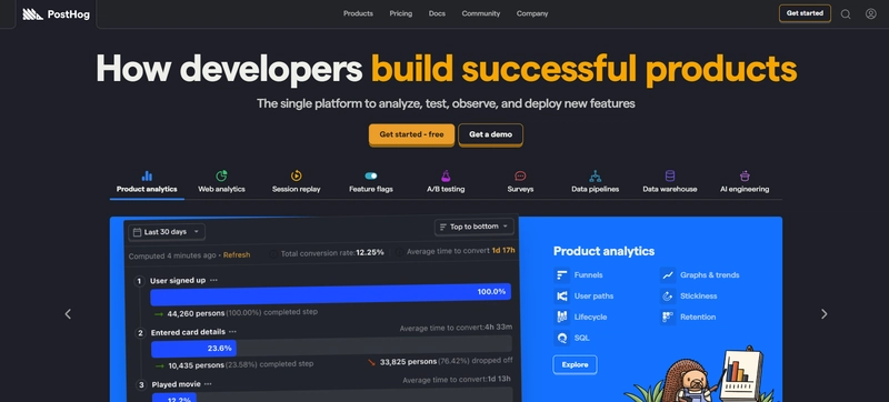 PostHog — это платформа аналитики продуктов с открытым исходным кодом, призванная помочь командам отслеживать поведение пользователей и повышать производительность продуктов. Он предлагает комплексные инструменты аналитики, включая отслеживание пользователей, отслеживание событий и флаги функций, и все это на одной платформе. С помощью PostHog команды могут получить ценную информацию о том, как пользователи взаимодействуют с их продуктами и принимают решения на основе данных.