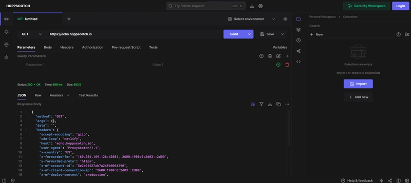 Hoppscotch — это экосистема разработки API с открытым исходным кодом, которая упрощает тестирование и документирование API. Он предоставляет удобный интерфейс для создания и тестирования HTTP-запросов, управления коллекциями API и создания документации API.