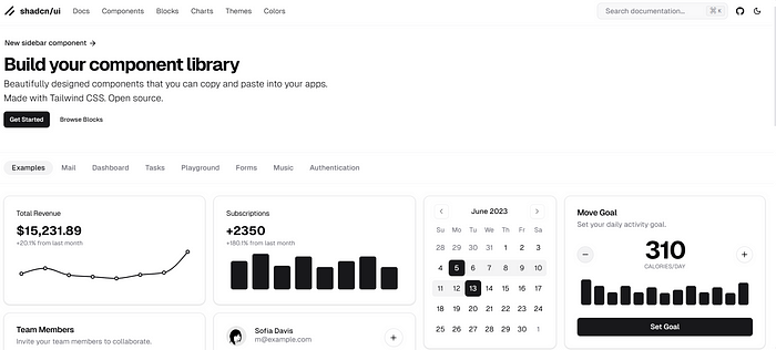 Shadcn/ui — полностью адаптивный инструмент с открытым исходным кодом. Он предоставляет широкий спектр примеров для удовлетворения различных бизнес-требований.