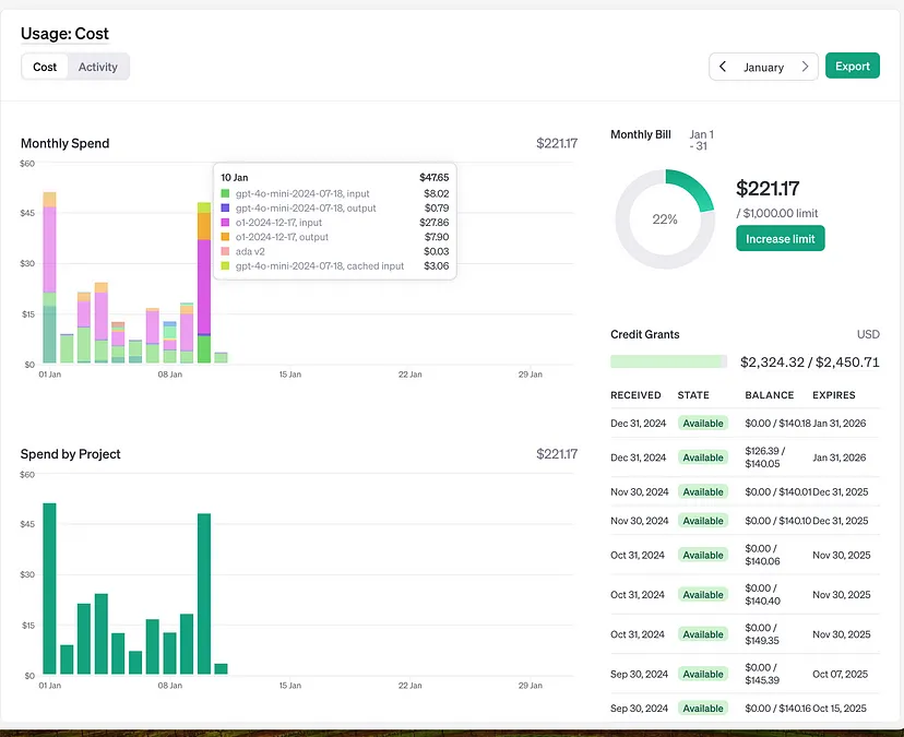 Сиреневая и оранжевая колонки — стоимость модели o1 от OpenAI. Я использую ее примерно 4-5 раз в день для очень интенсивных задач, таких как генерация синтаксически корректных запросов для анализа акций.