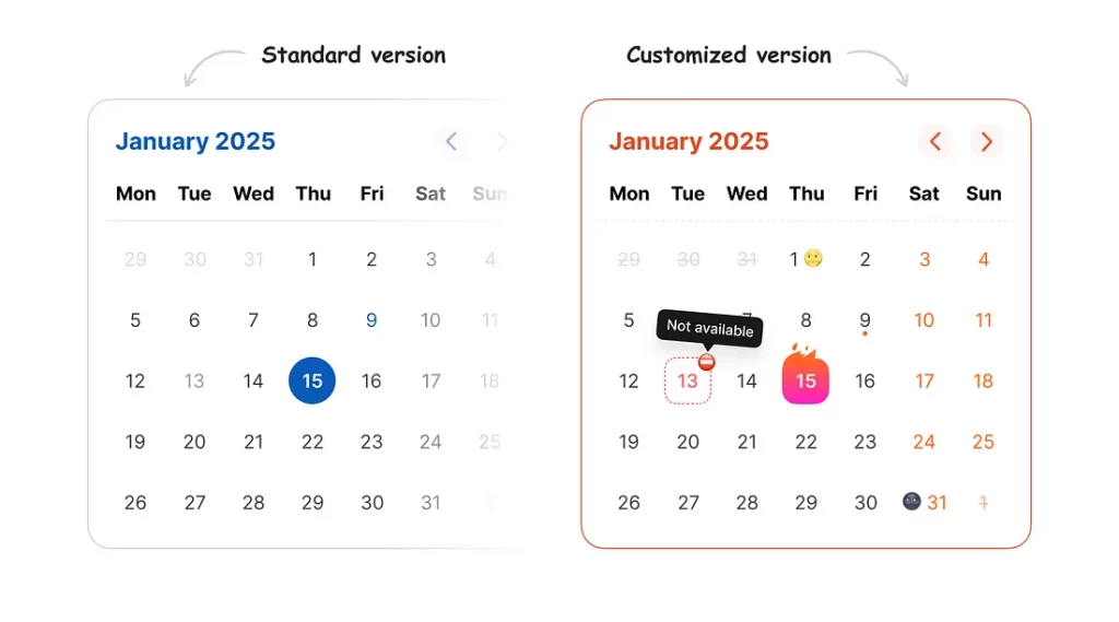 Как видно из второй версии Calendar, показанной выше, для изменения ячейки часто требуется нечто большее, чем просто изменение стилей или создание псевдоэлементов с помощью CSS. В одних случаях нужно вставить иконки/»булавки», а в других — оперативные подсказки, выводимые на экран при наведении курсора. Такие сценарии часто встречаются в бизнес-логике, управляемой клиентом, поэтому очень важно, чтобы компонент был гибким для настройки.