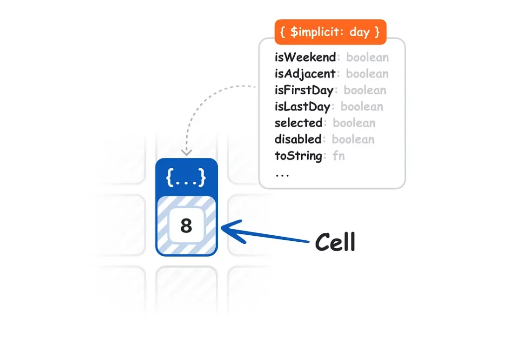 В случае с Calendar шаблон ячейки может включать контекст с вычисляемыми метаданными для отображаемого дня: