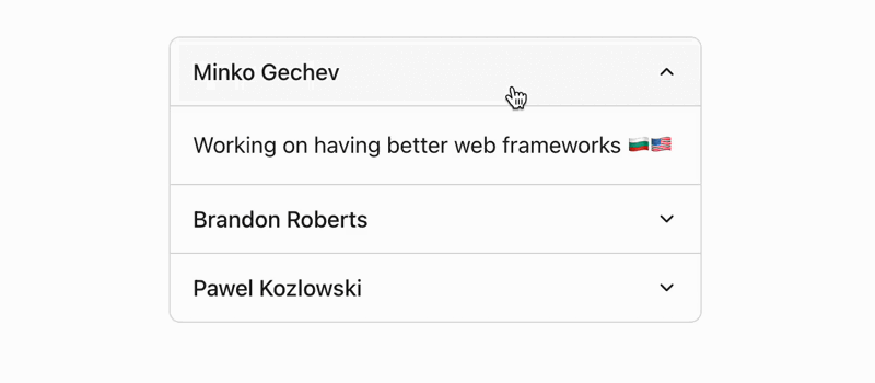 Accordion — отличный пример вариативности подходов. Складной элемент имеет 3 слота: title, icon и content.