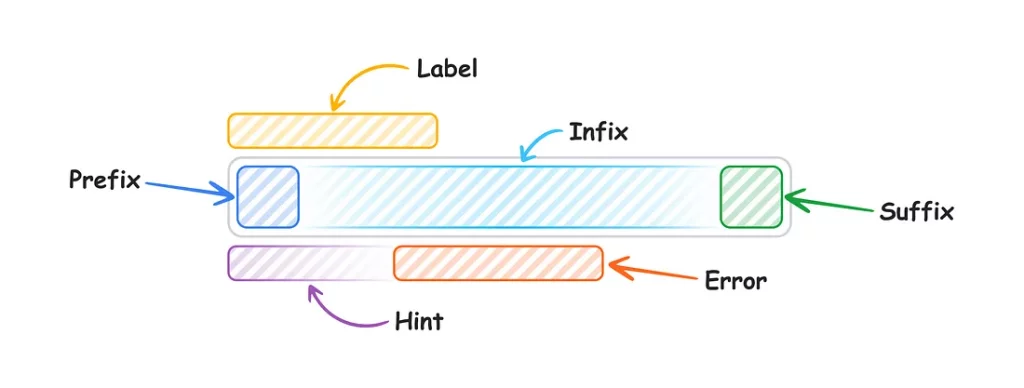 Сразу перейдем к практическому примеру. Предположим, мы разрабатываем компонент Field, который отображает ввод. Как правило, элемент ввода редко используется сам по себе. В некоторых случаях необходимо включить метку (label) с автоматической привязкой атрибута [for], отобразить обратную связь, например сообщение об ошибке (error message), если поле недействительно, или предоставить текст подсказки (hint). Иногда может потребоваться добавить иконку (icon) или интерактивный элемент с одной стороны поля ввода.