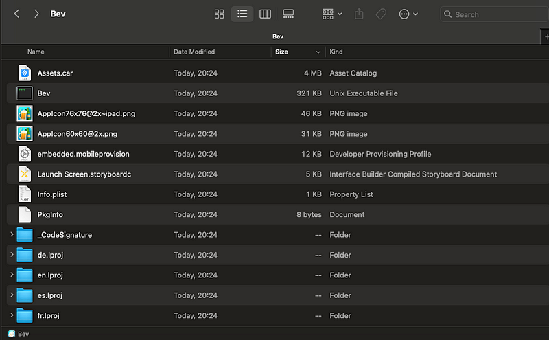Самое ценное находится в Bev — UNIX-исполняемом файле моего стороннего проекта. Он содержит весь скомпилированный и связанный код приложения.