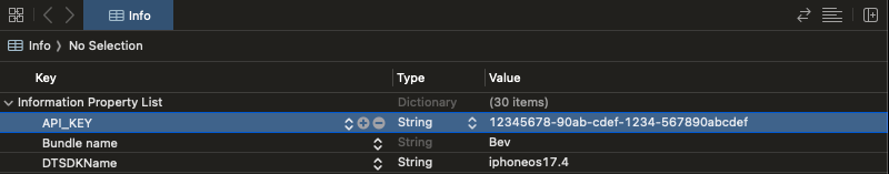 Здесь несколько подуровней сложности. Вместо непосредственного жесткого написания кода ключей, вы можете использовать несколько наборов ключей для разработки и производства. Можно создавать файлы .xcconfig для каждой среды, которые разрешаются в значения Info.plist во время сборки.