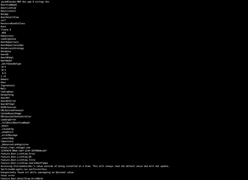 С помощью встроенной UNIX-команды strings можно инспектировать каждую неформатированную строку, которая находится внутри этого скомпилированного исполняемого файла.