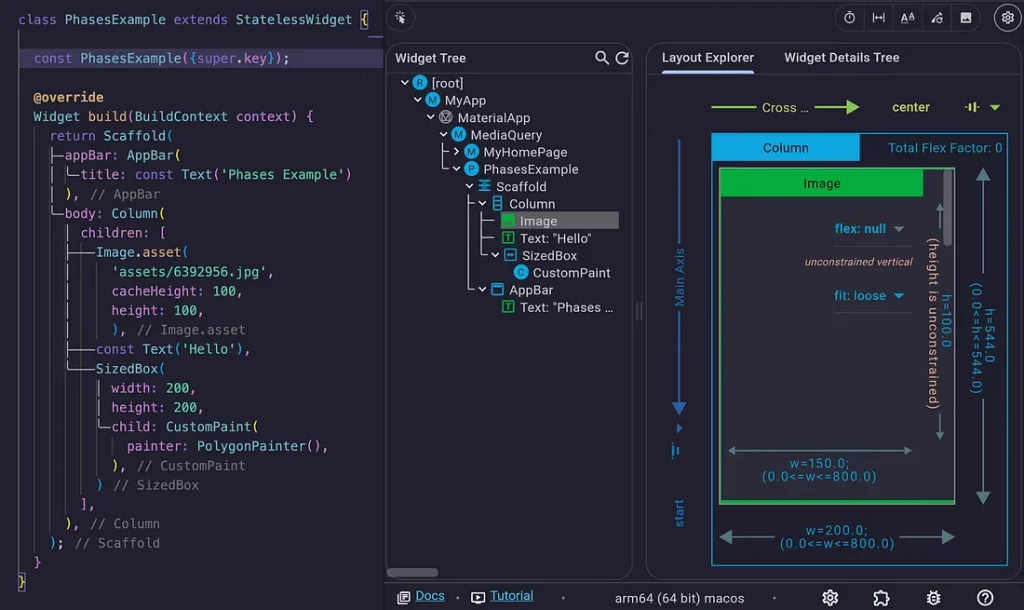- Макет (Layout): определение размера и положения каждого виджета (родительские ограничения определяют размеры дочерних).