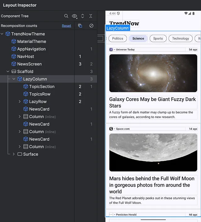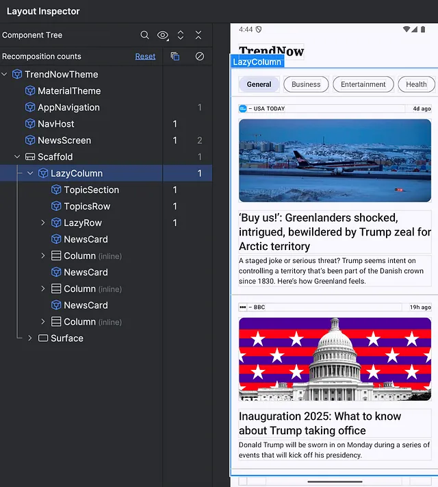 Выполнить это не так-то просто: нужно убедиться, что изменения selectedTopic не вызовут ненужной рекомпозиции, поскольку и trendingNews, и topics зависят от этого. Перепробовав несколько подходов, я решил остановиться на следующем: