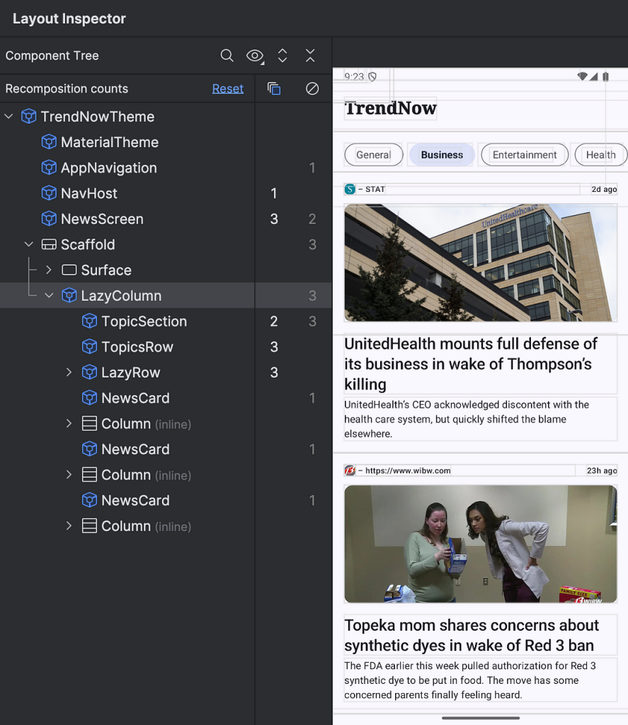 Количество рекомпозиций в Layout inspector (инспекторе макета)