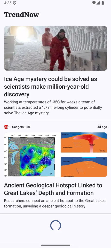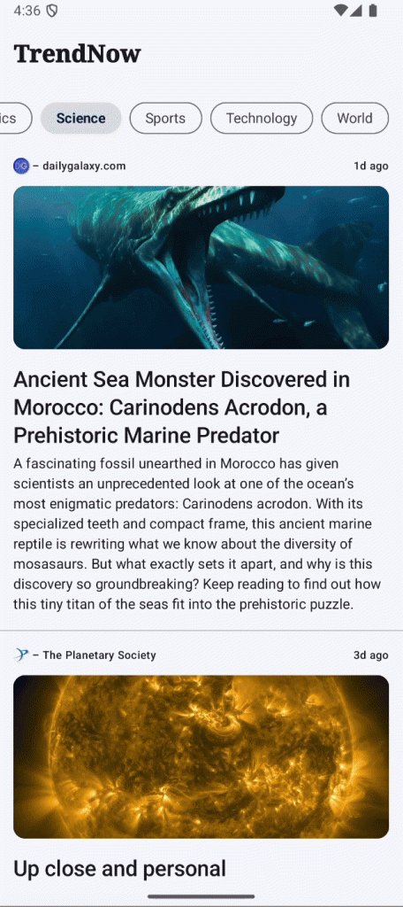 LazyColumnJetpack Compose бесконечной прокрутки приложение Trend Now может без проблем загружать больше трендовых новостей по мере того, как пользователь прокручивает список.