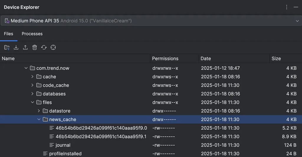 • Как видно на приведенном выше изображении, внутри каталога news_cache есть несколько файлов — это кэш ответов, созданный OkHtpp.