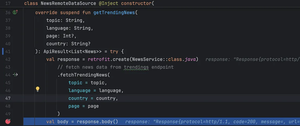 После всех вышеописанных изменений Retrofit должен использовать кэшированный ответ, если он доступен. Чтобы проверить это, добавлю точку останова в NewsRemoteDataSource, когда приложение вызовет fetchTrendingNews() во второй раз.