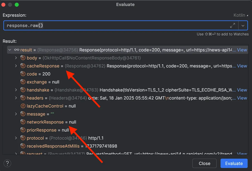 При оценке response.raw() выясняется: cacheResponse не равен null, а networkResponse равен null. Это означает, что ответ получен из кэша.