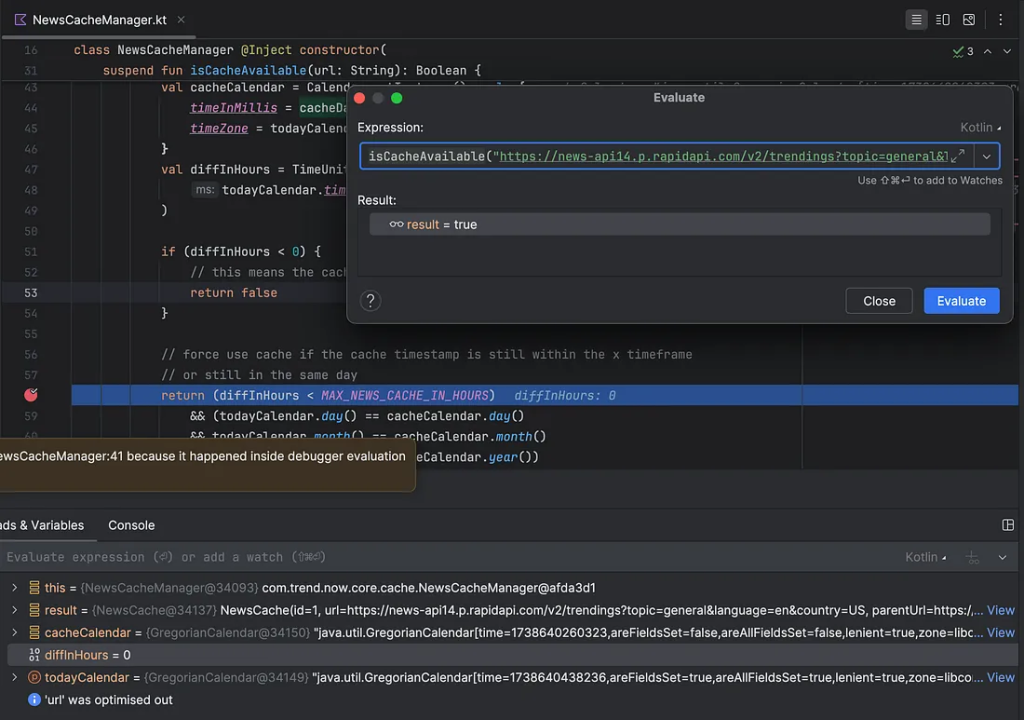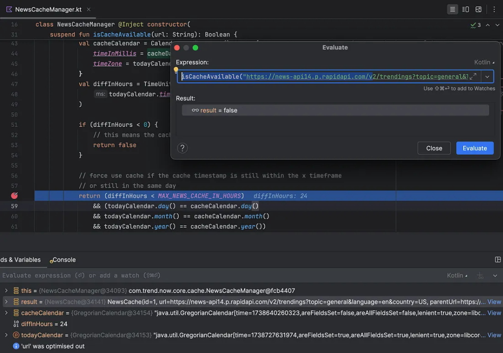 • Замените проверку кэша с cache.urls().find { it == url } на newsCacheManager.isCacheAvailable(url).