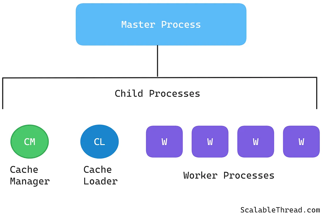 - Ведущий процесс занимается загрузкой конфигурации сервера и созданием дочерних процессов — трех остальных компонентов.