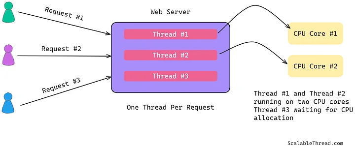 На традиционных веб-серверах при конкурентной обработке запросов каждому запросу назначается отдельный поток или процесс. Этими потоками впустую тратятся вычислительные ресурсы памяти и процессора, которые блокируются в ожидании завершения запросов во время сетевых операций или операций ввода-вывода.
