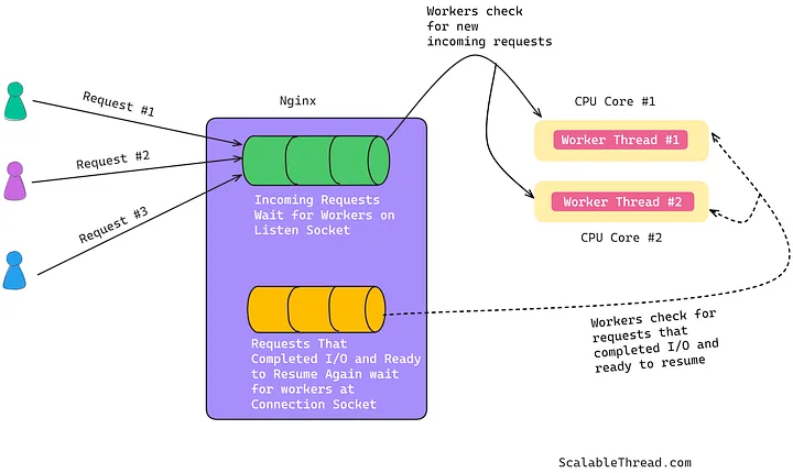 В отличие от традиционных серверов, на Nginx для каждого входящего запроса не создается отдельного процесса или потока. Каждым рабочим процессом прослушиваются события, генерируемые новыми входящими запросами. Рабочими процессами же принимаются запросы на подключение и начинается обработка.