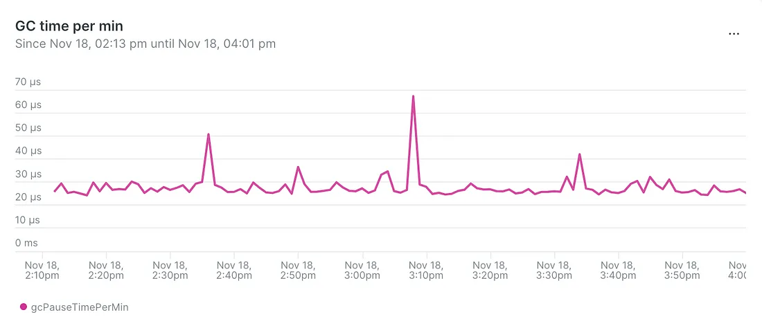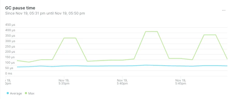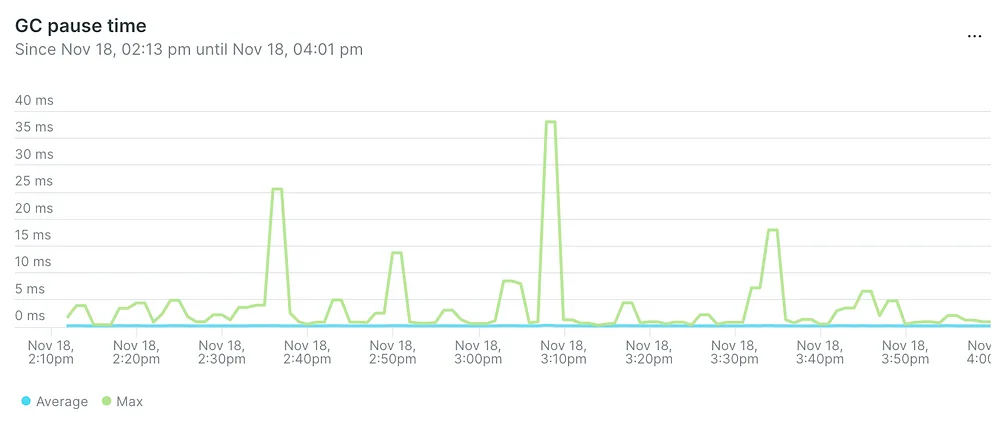 • Продолжительность пауз, вызванных работой сборщика мусора, уменьшилась с 40 мс до 400 мкс на пике: